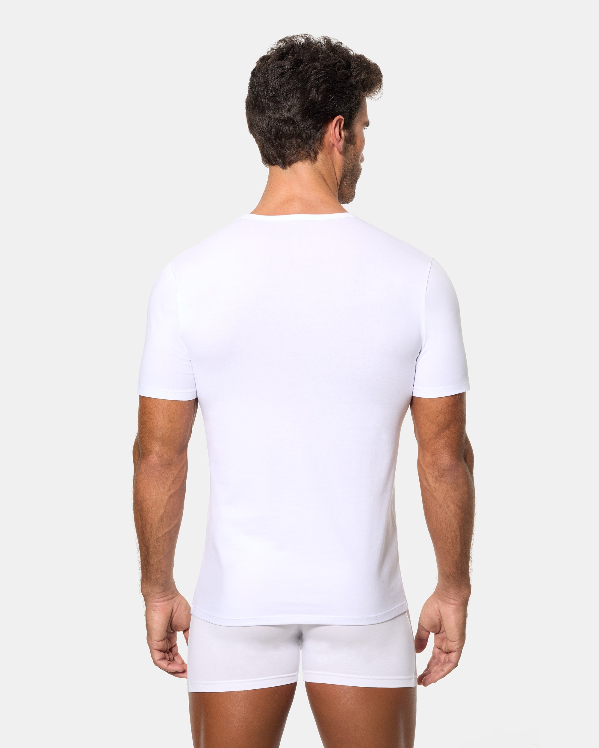 Camiseta de manga corta blanca para hombre con cuello pico, diseñada con la innovadora tecnología Regul'activ. Este sistema termorregulador mejora la distribución del sudor y acelera la evaporación de la humedad, adaptándose a las variaciones de temperatura corporal. Gracias a su tejido elástico de algodón, se ajusta al cuerpo como una segunda piel, ofreciendo comodidad y frescura durante todo el día.