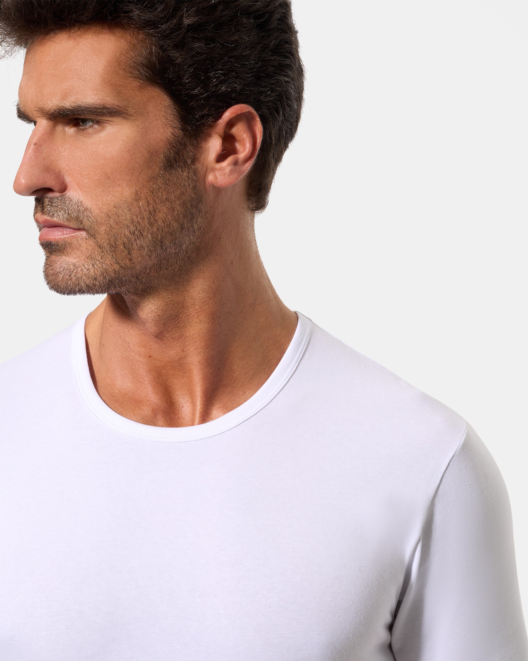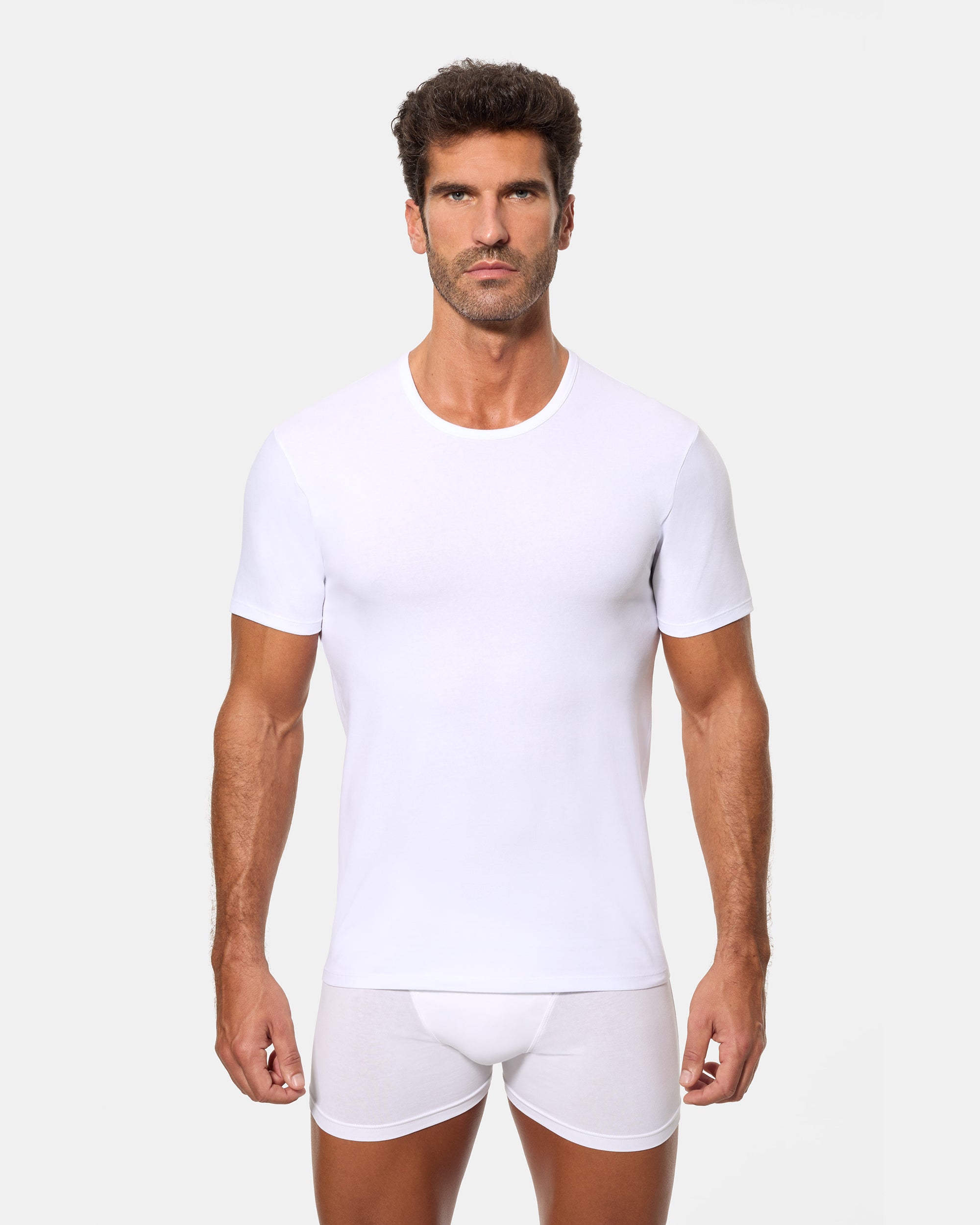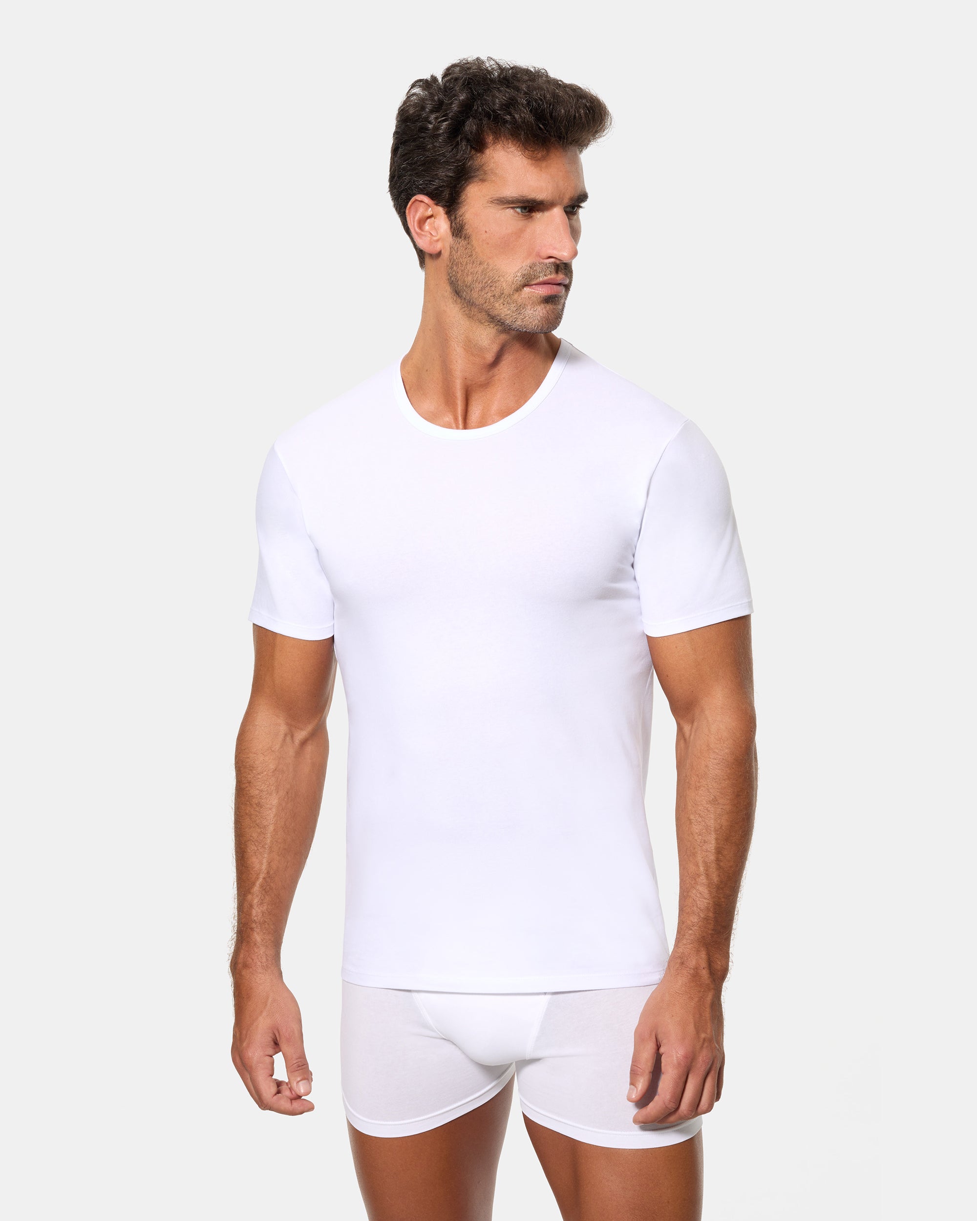 Camiseta de manga corta blanca para hombre con cuello redondo, fabricada con la tecnología termorreguladora Regul'activ. Esta tecnología optimiza la distribución del sudor y acelera la evaporación de la humedad, activándose automáticamente cuando la temperatura corporal varía. Con su algodón elástico, se adapta al cuerpo como una segunda piel, proporcionándote confort y frescura durante todo el día.