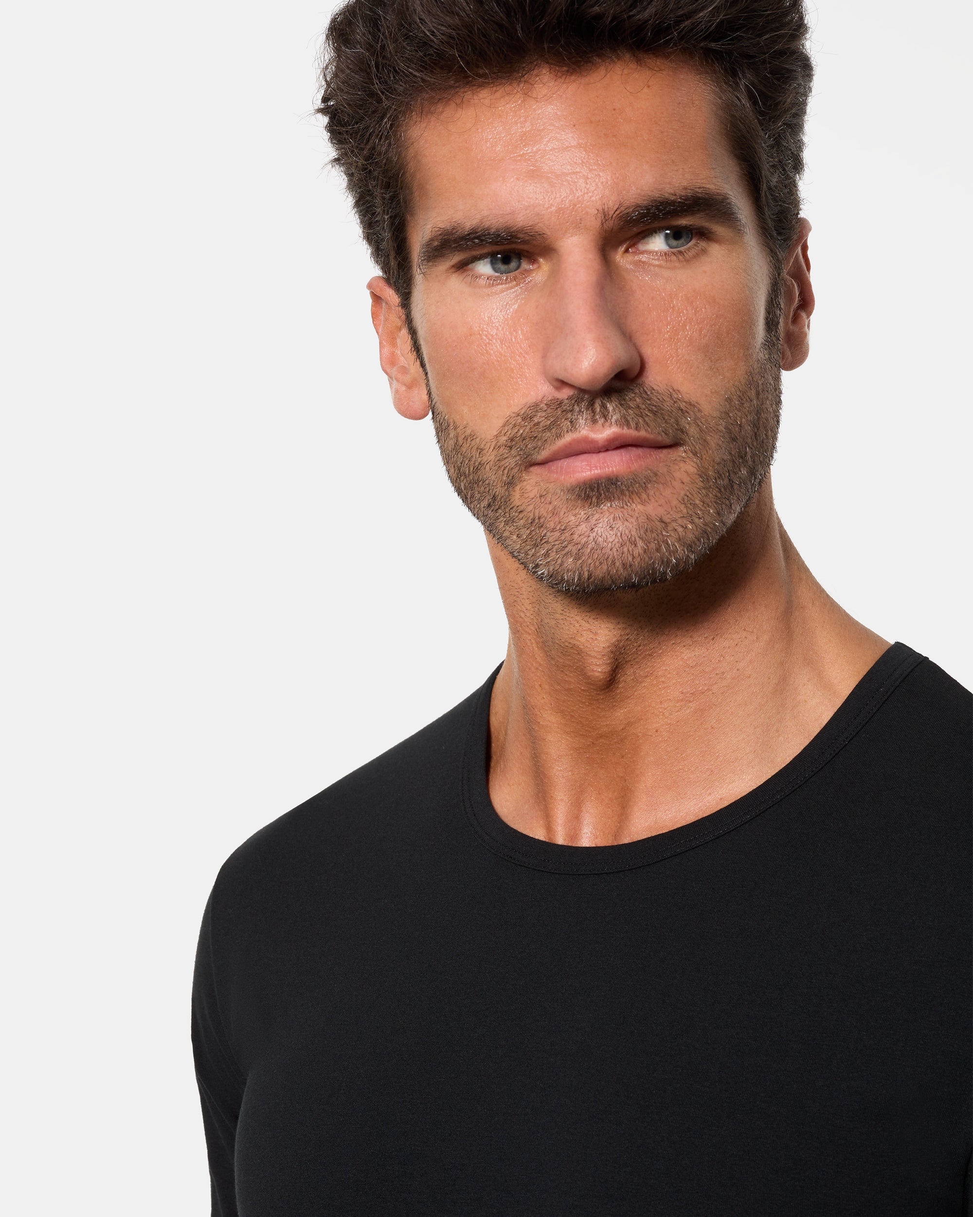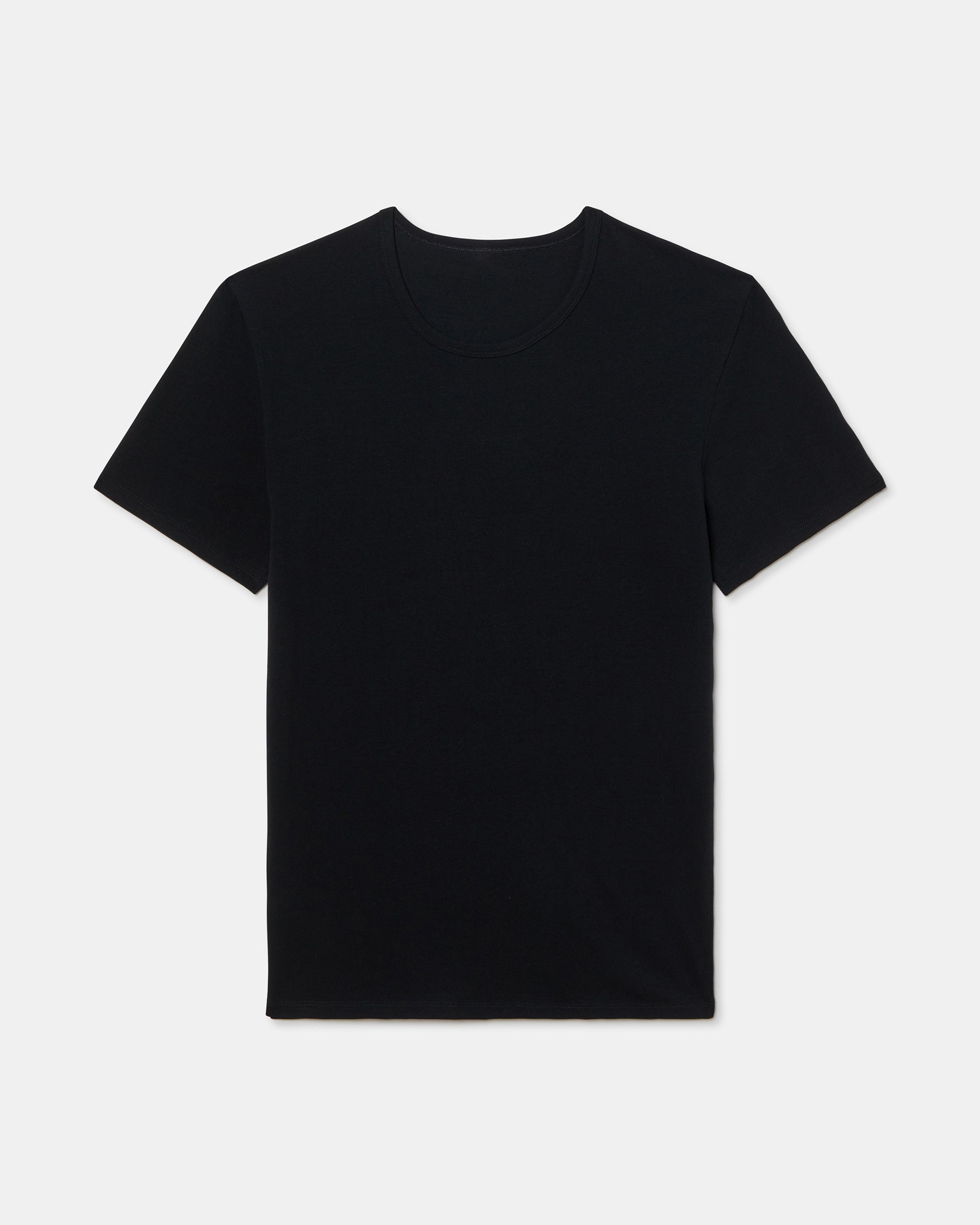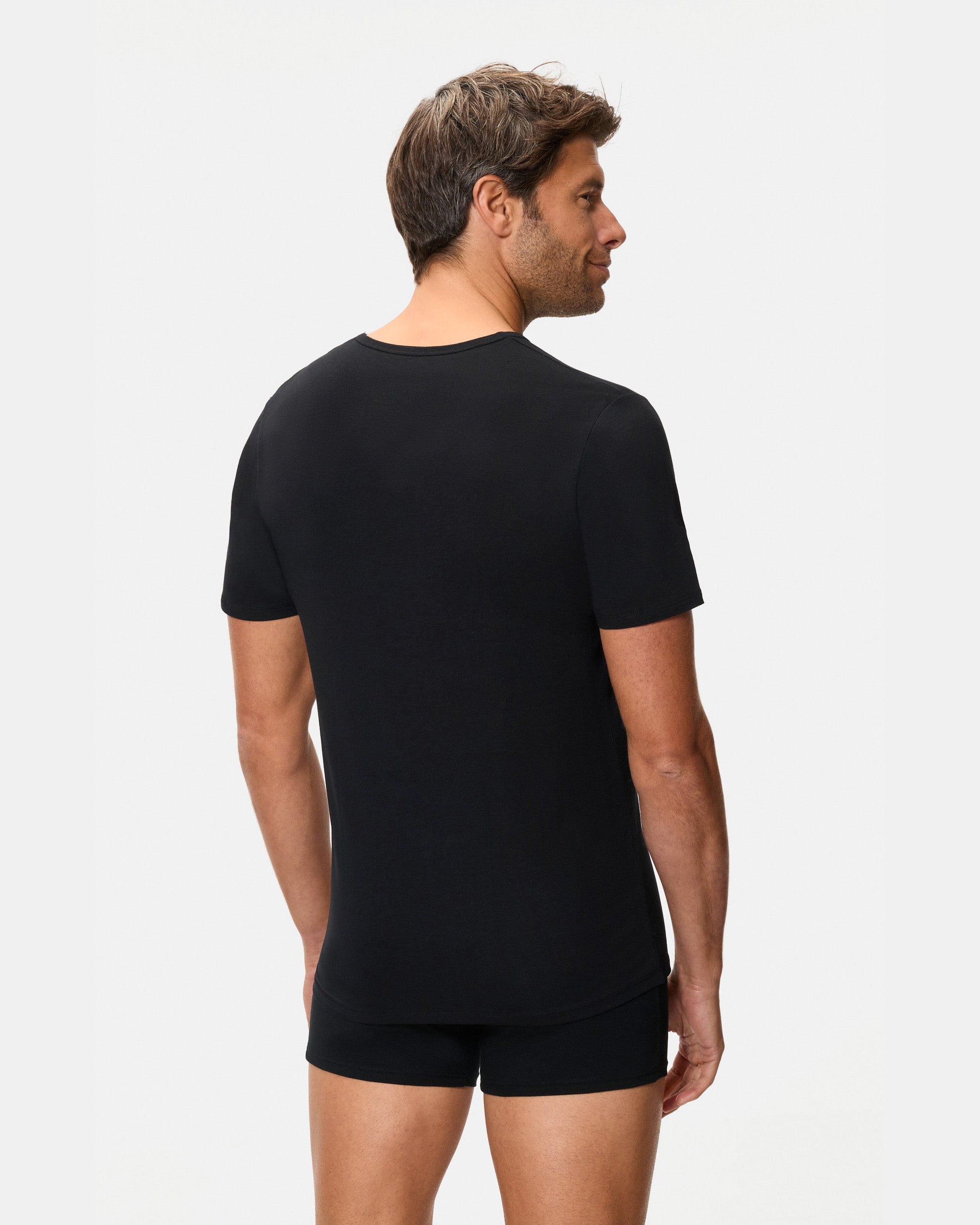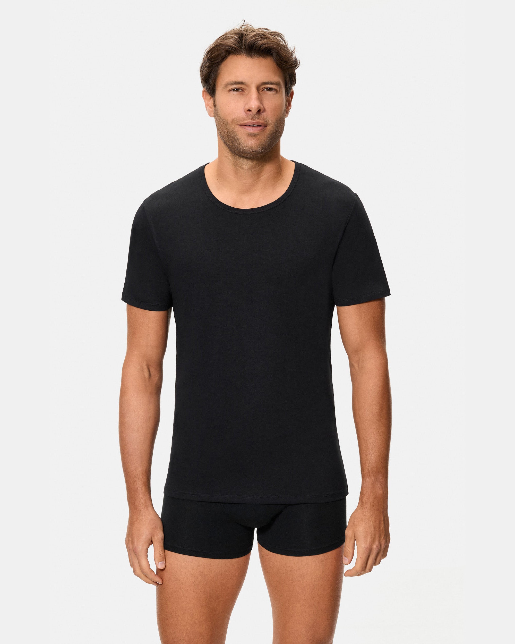 Camiseta de manga corta negra para hombre con cuello redondo, fabricada con la tecnología termorreguladora Regul'activ. Esta tecnología optimiza la distribución del sudor y acelera la evaporación de la humedad, activándose automáticamente cuando la temperatura corporal varía. Con su algodón elástico, se adapta al cuerpo como una segunda piel, proporcionándote confort y frescura durante todo el día.