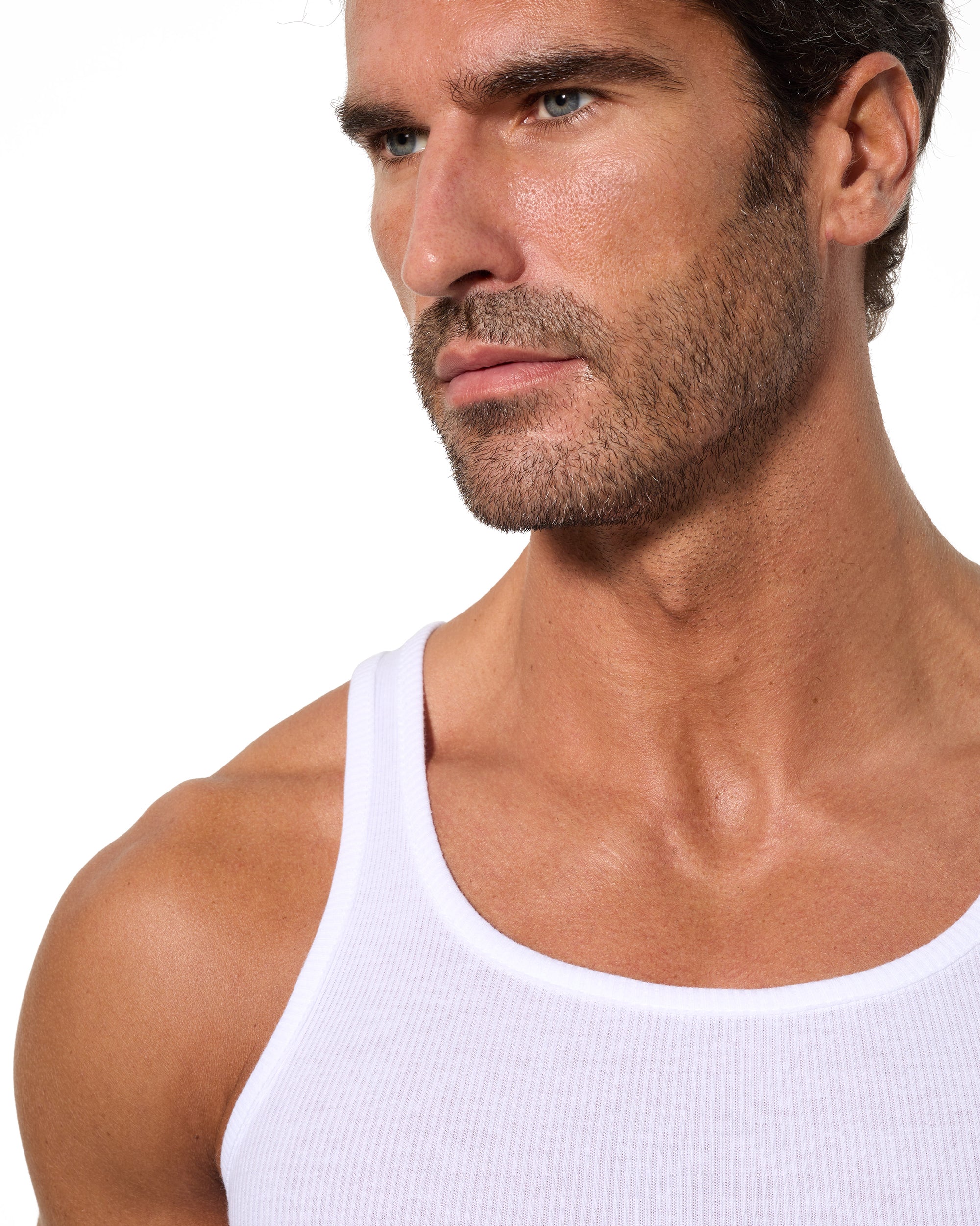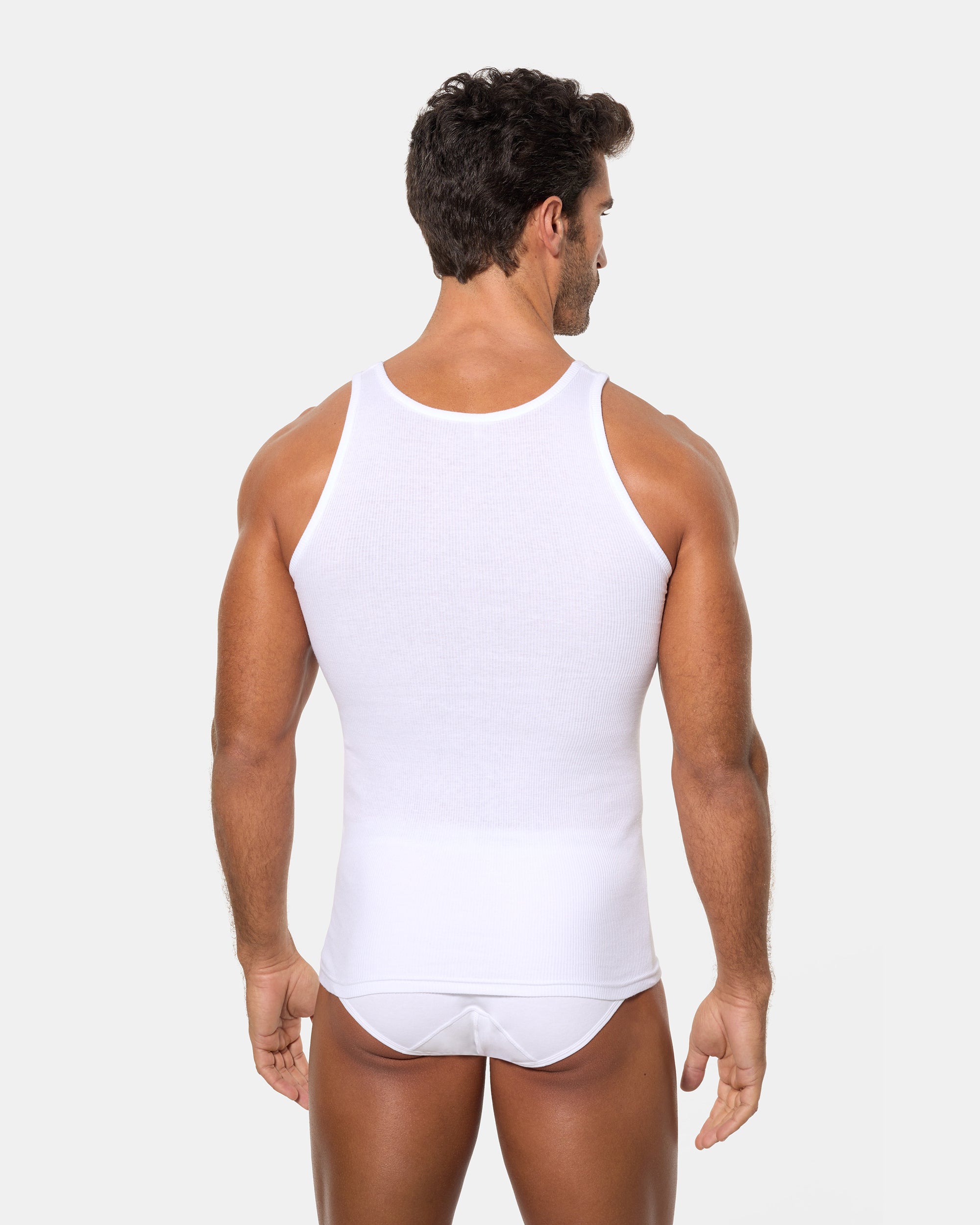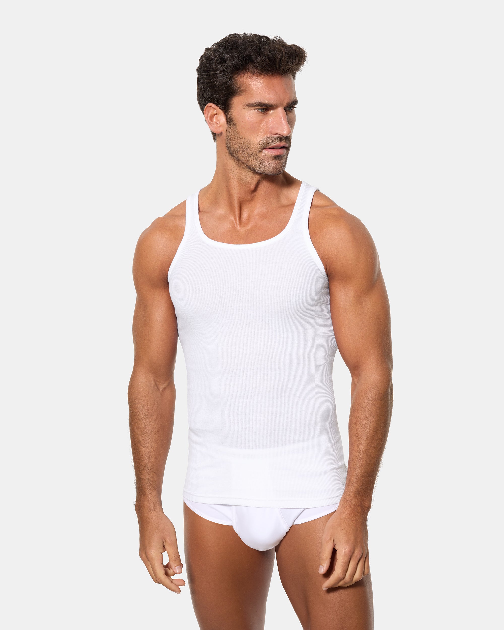 Camiseta de tirantes blanca para hombre, confeccionada en algodón 100% de alta calidad y con tejido canalé 2x2. Su diseño ofrece una comodidad y transpirabilidad excepcionales, adaptándose perfectamente al cuerpo. Ideal como prenda interior, proporciona un ajuste cómodo y fresco durante todo el día.