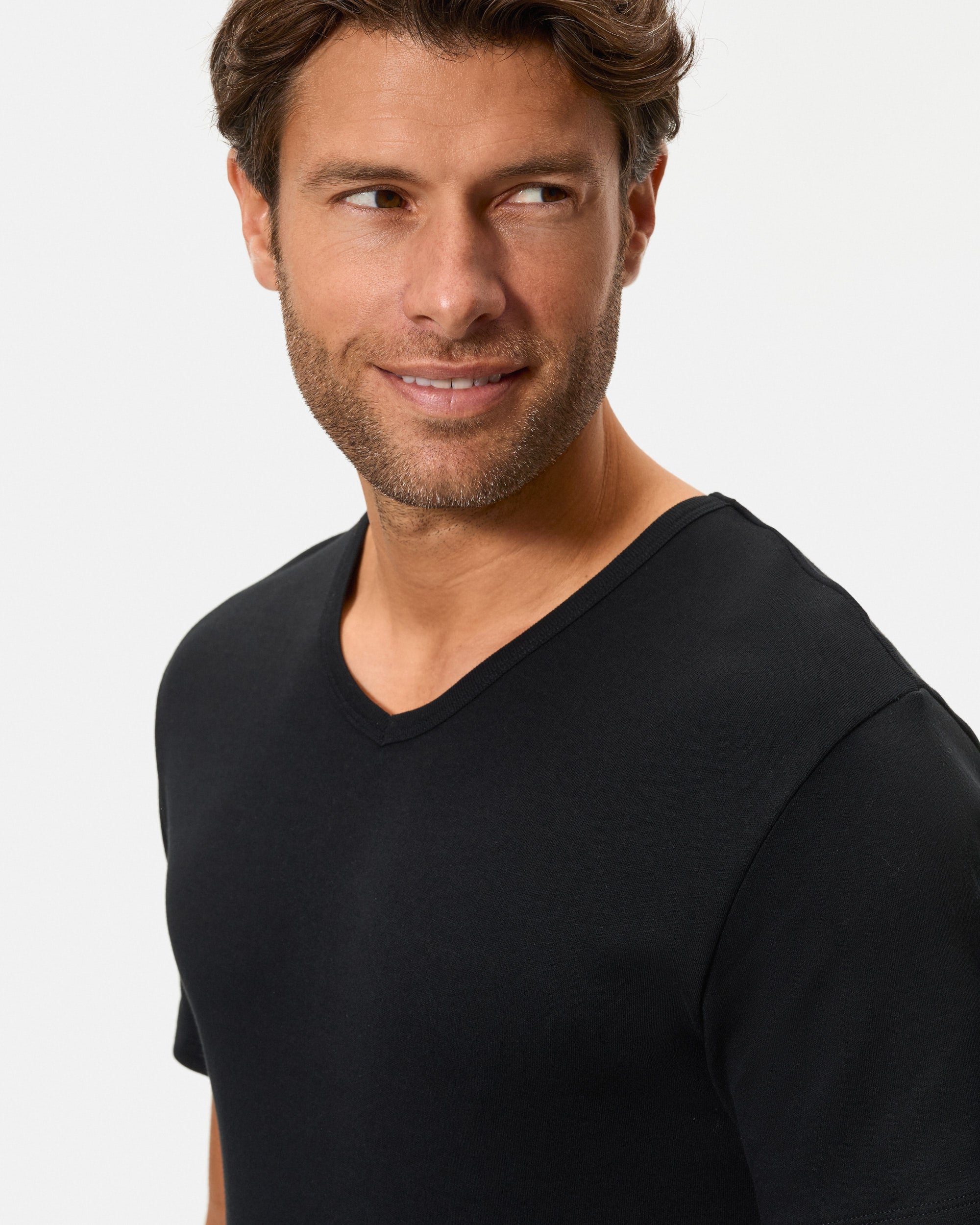 Camiseta interior térmica de manga corta y cuello pico para hombre, hecha de algodón 100% con tejido Interlock. El interior afelpado proporciona un calor adicional, mientras que el tejido liso ofrece una suavidad inigualable al contacto con la piel. Su color negro aporta un toque moderno y versátil, ideal para combinar con otros estilos o como base para un look de capas.