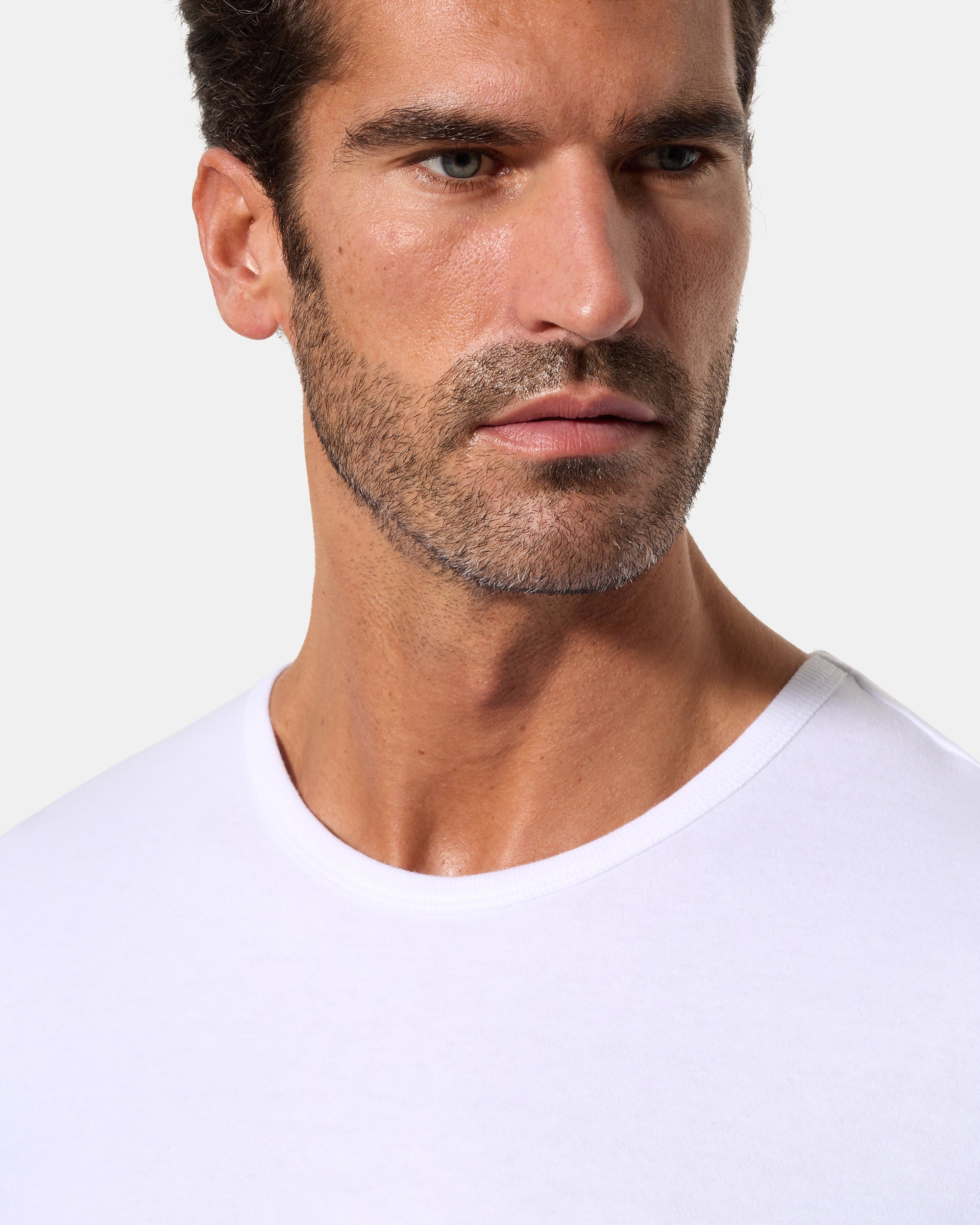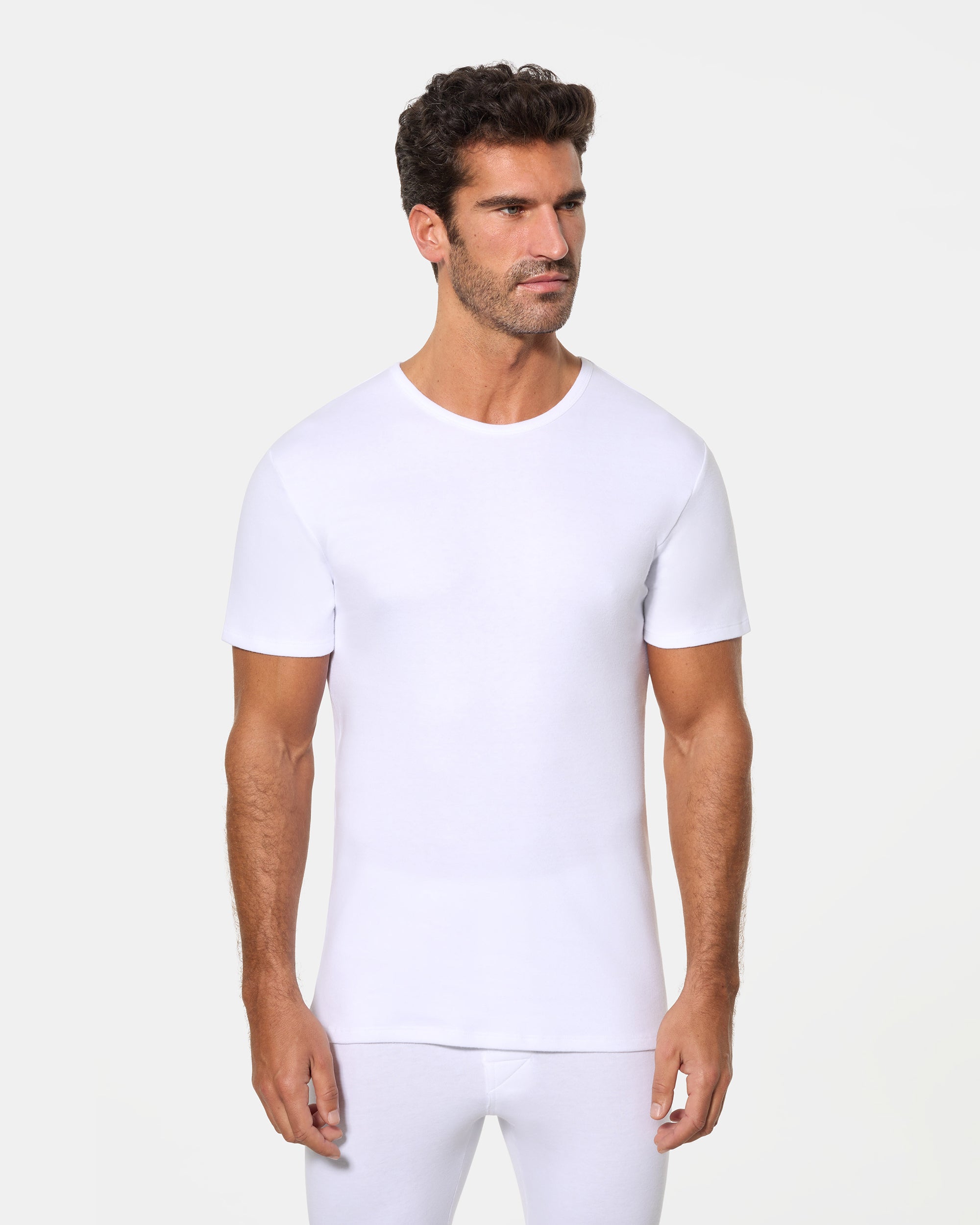 Camiseta térmica de manga corta y cuello redondo para hombre, confeccionada con algodón 100%. Suave al tacto, con tejido Interlock liso y un interior afelpado que proporciona un calor extra para mantenerte cómodo durante todo el día. Su diseño blanco es perfecto como prenda interior o para un look más casual y fresco.