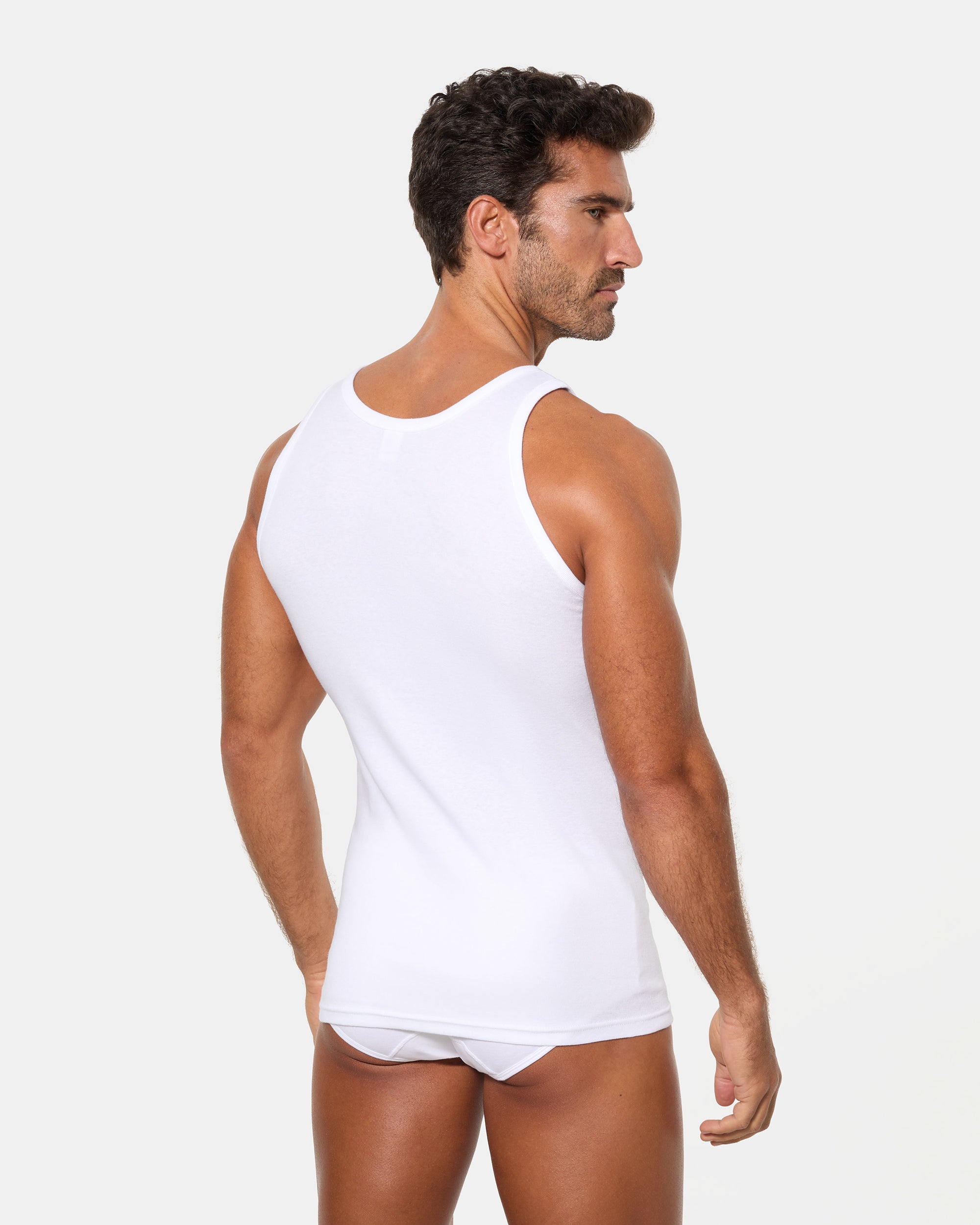 Pack de 4 camisetas de tirantes blancas para hombre, confeccionadas en algodón 100% de alta calidad y tejido canalé 1x1. Este pack ofrece comodidad, transpirabilidad y un ajuste perfecto al cuerpo. Ideal para usar como prenda interior o para actividades cotidianas. Cada camiseta está diseñada para brindarte confort durante todo el día, adaptándose a tu cuerpo como una segunda piel.