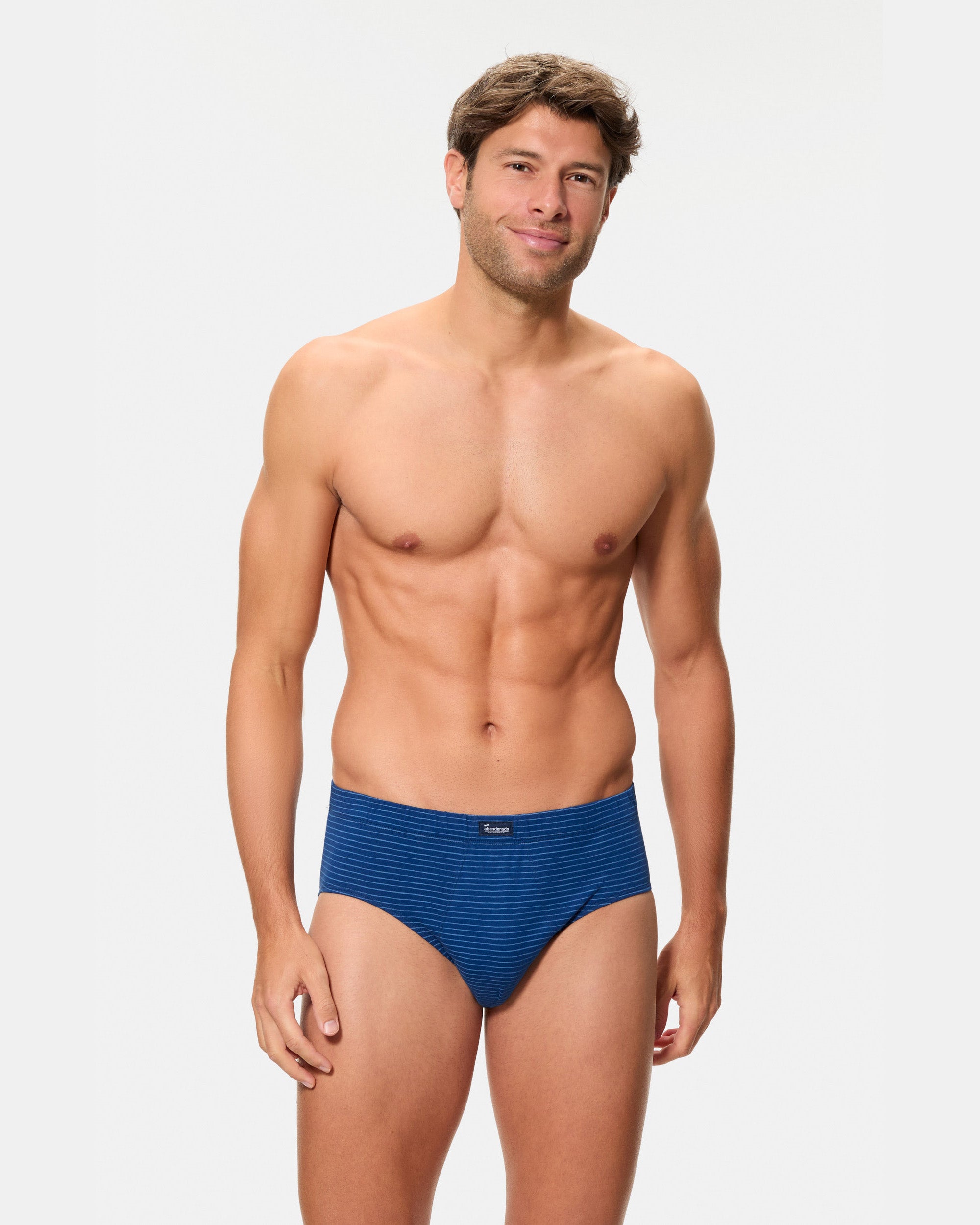 Disfruta de la comodidad diaria con este pack de 3 slips semicortos de hombre en tonos azules, elaborados en algodón 100%. El diseño de inspiración clásica combina estampados de rayas y puntos para un estilo elegante, mientras que el tejido de punto liso ayuda a mantener la piel fresca y seca.