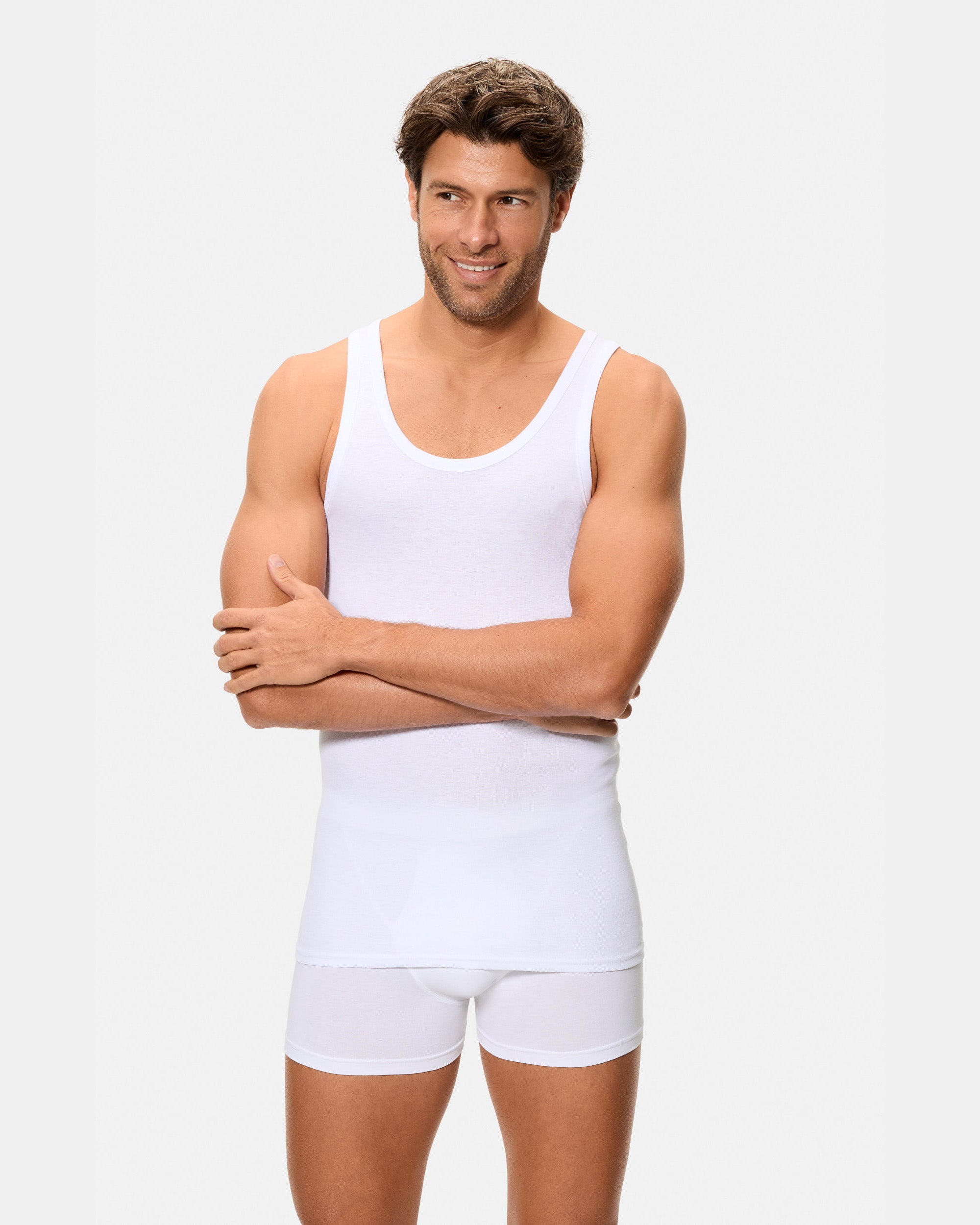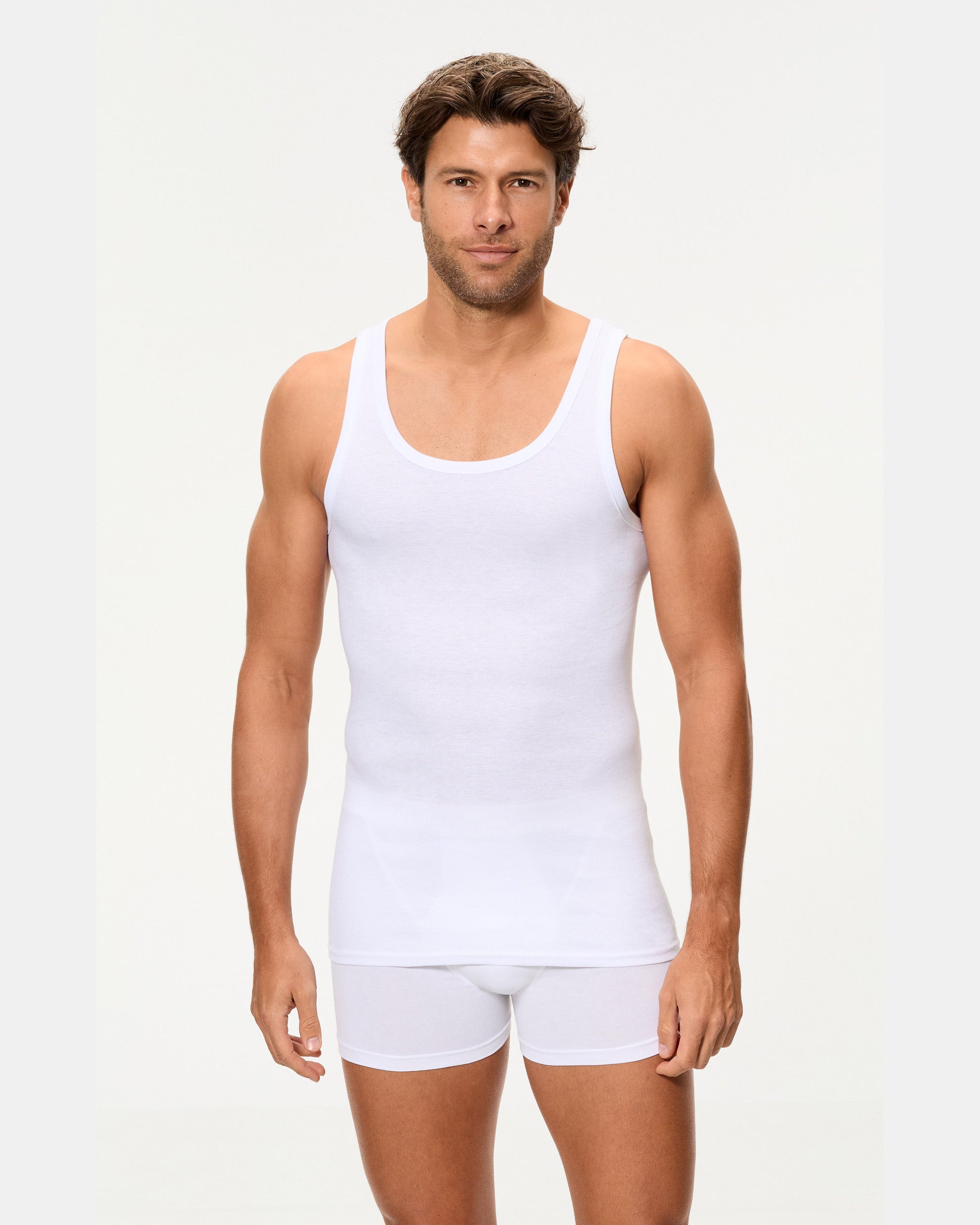 Camiseta de tirantes clásica para hombre, confeccionada en una mezcla de 50% algodón de alta calidad y 50% poliéster. Su tejido canalé 1x1 ofrece un ajuste cómodo y una gran transpirabilidad, garantizando confort y frescura durante todo el día. Además, su resistencia a los lavados la convierte en una prenda duradera para el uso diario.