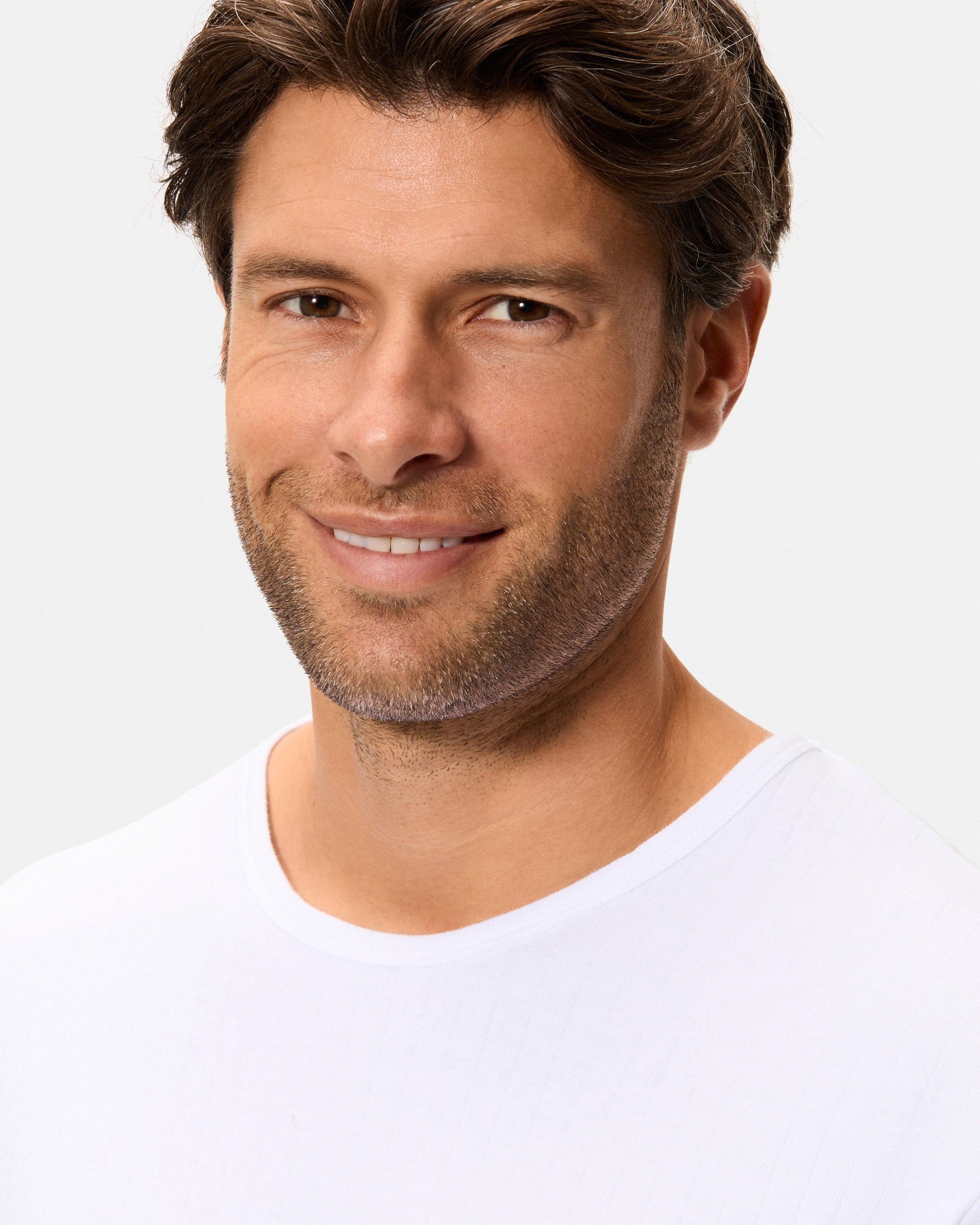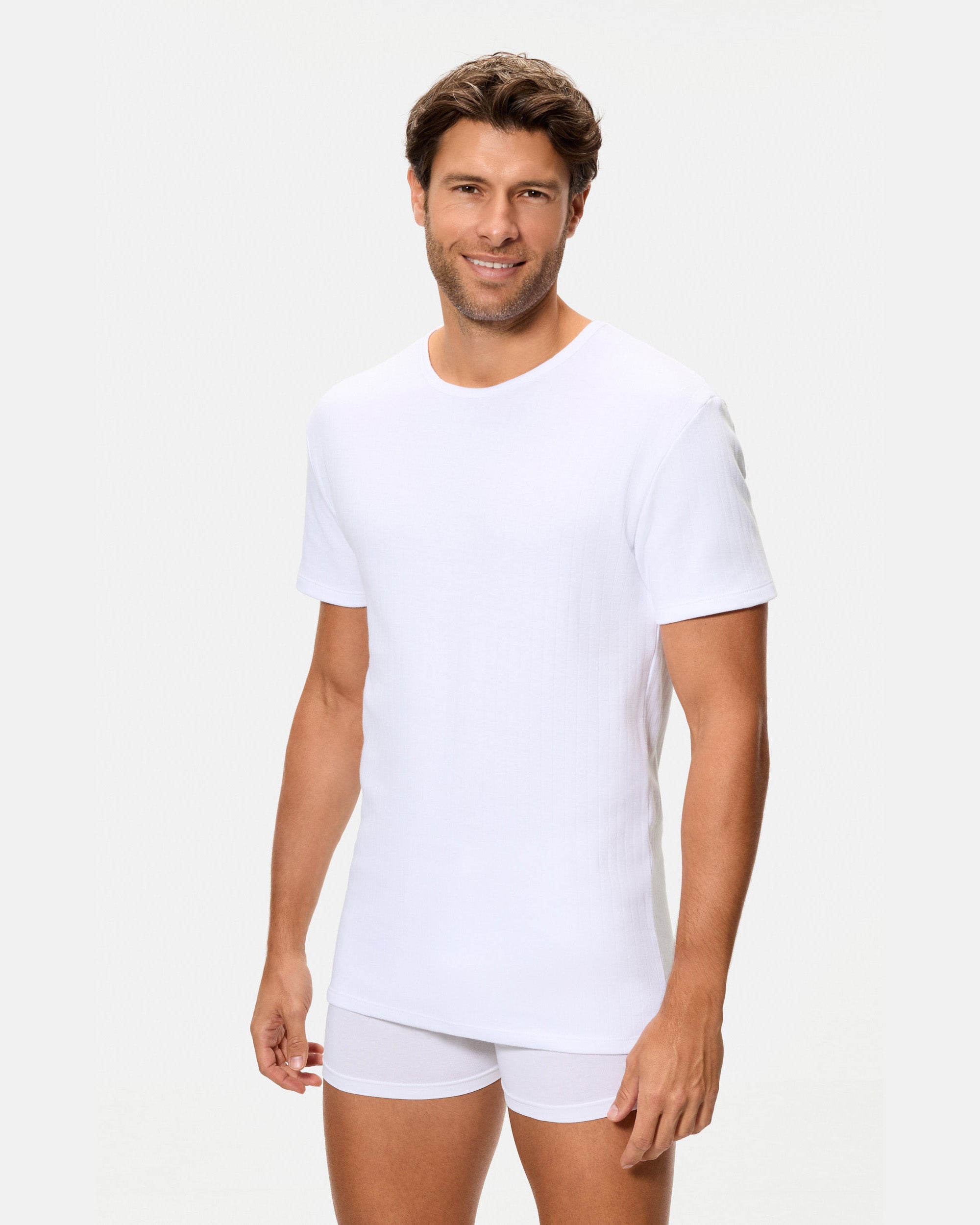 Esta camiseta interior térmica de hombre de manga corta y cuello redondo con acabado canalé está confeccionada en algodón 100%. Su interior afelpado ofrece un extra de calidez y una suavidad agradable, mientras que el tejido interlock desagujado favorece un ajuste cómodo para llevar como prenda interior en climas fríos.